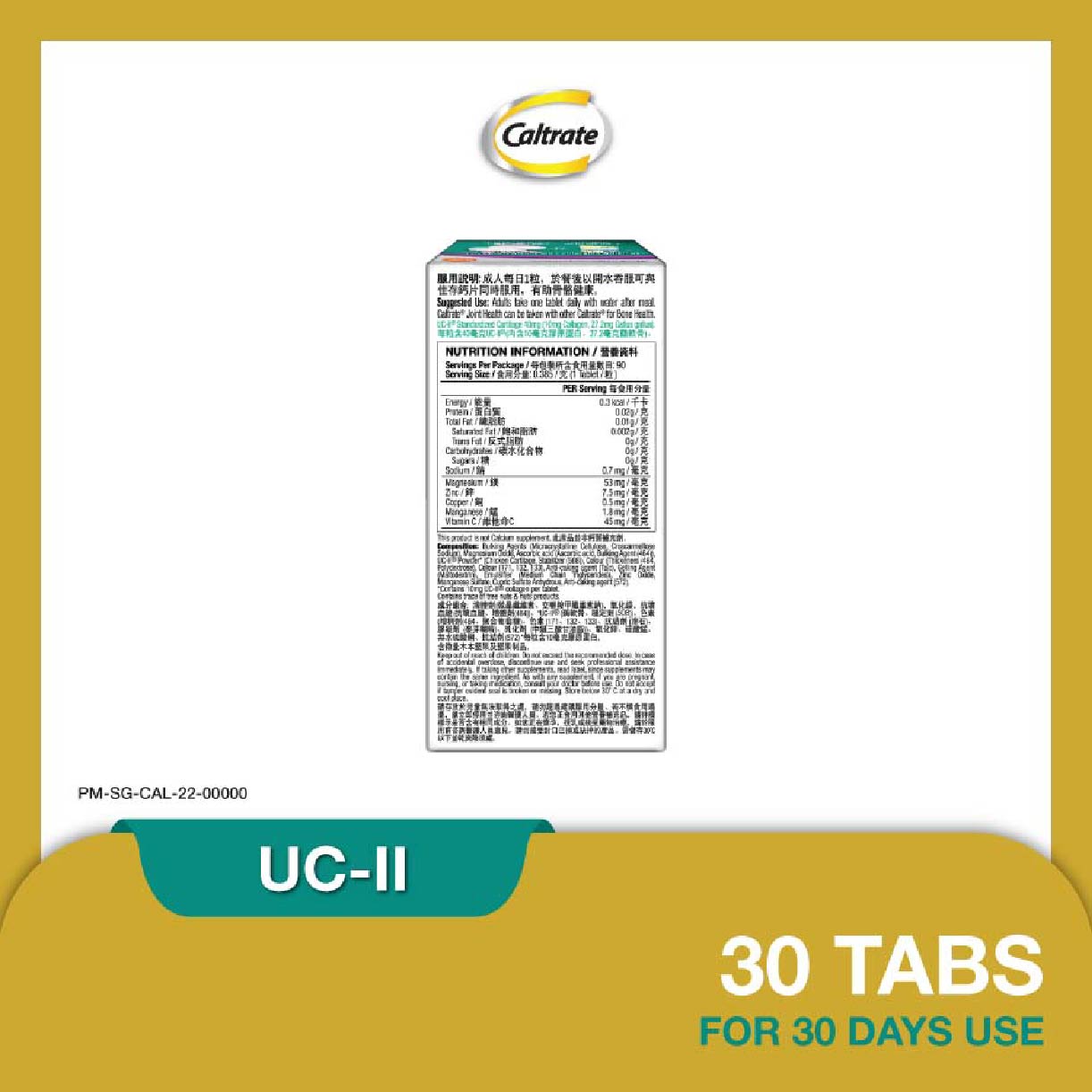 Support your joint health with the Caltrate Joint Health Undenatured Collagen Type II (UC-II). Caltrate Joint Health UC-II contains UC-II undenatured collagen type II, a patented ingredient that has been clinically tested to reduce joint discomfort such as stiffness and promote healthy cartilage and joint flexibility for healthier and longer active living.