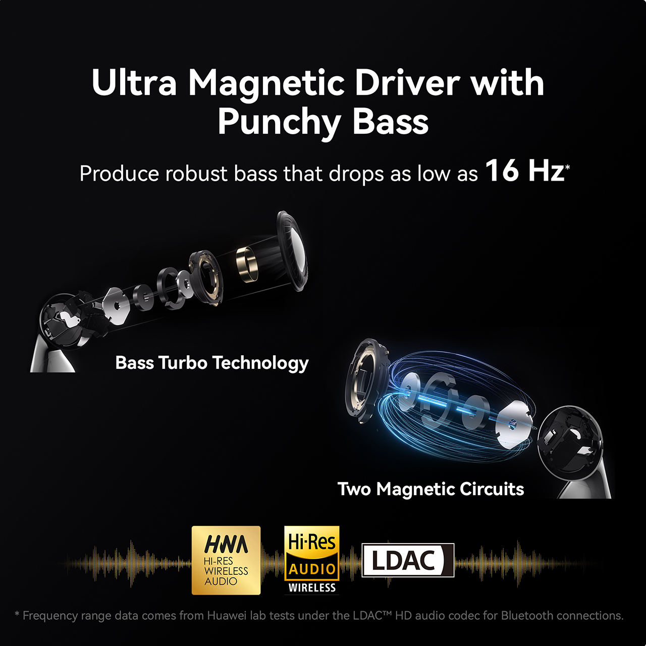 • Frequency range data comes from Huawei lab tests under the LDAC™ HD audio codec for Bluetooth connections.