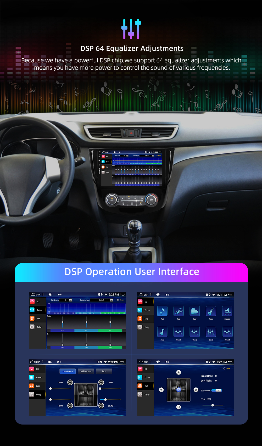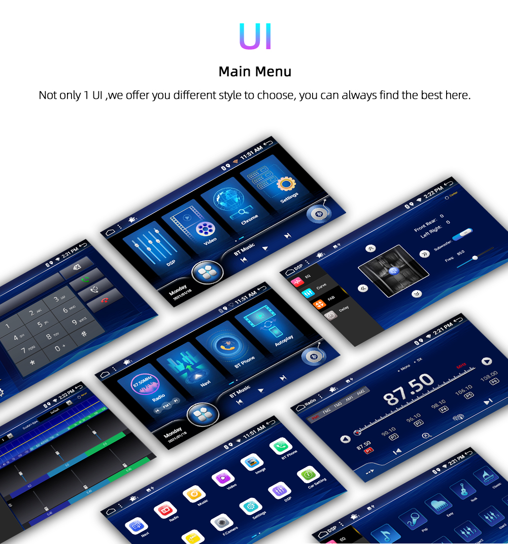 • DSP+Carplay+Touch Screen+Radio+FM/AM+RDS+GPS Navigation+MAP+Wifi+Bluetooth+Steering Wheel Control +Split Screen + USB+SD+AUX in/Out+Mirror Link+Rear View Camera+Subwoofer+Play Sore+EQ+Wallpaper Set+Car Logo+3G/4G+TPMS+DAB+OBD 2+DVR+TV
