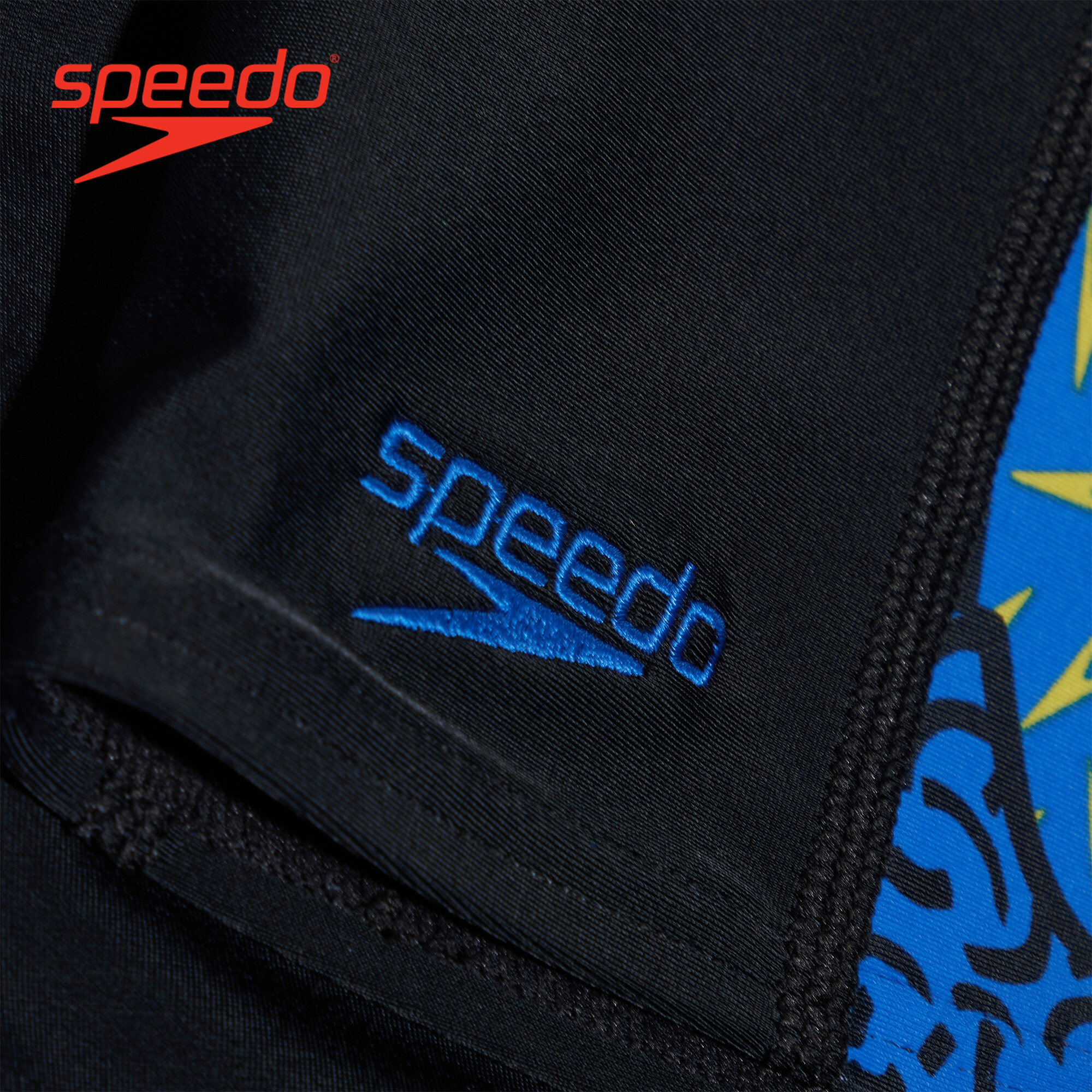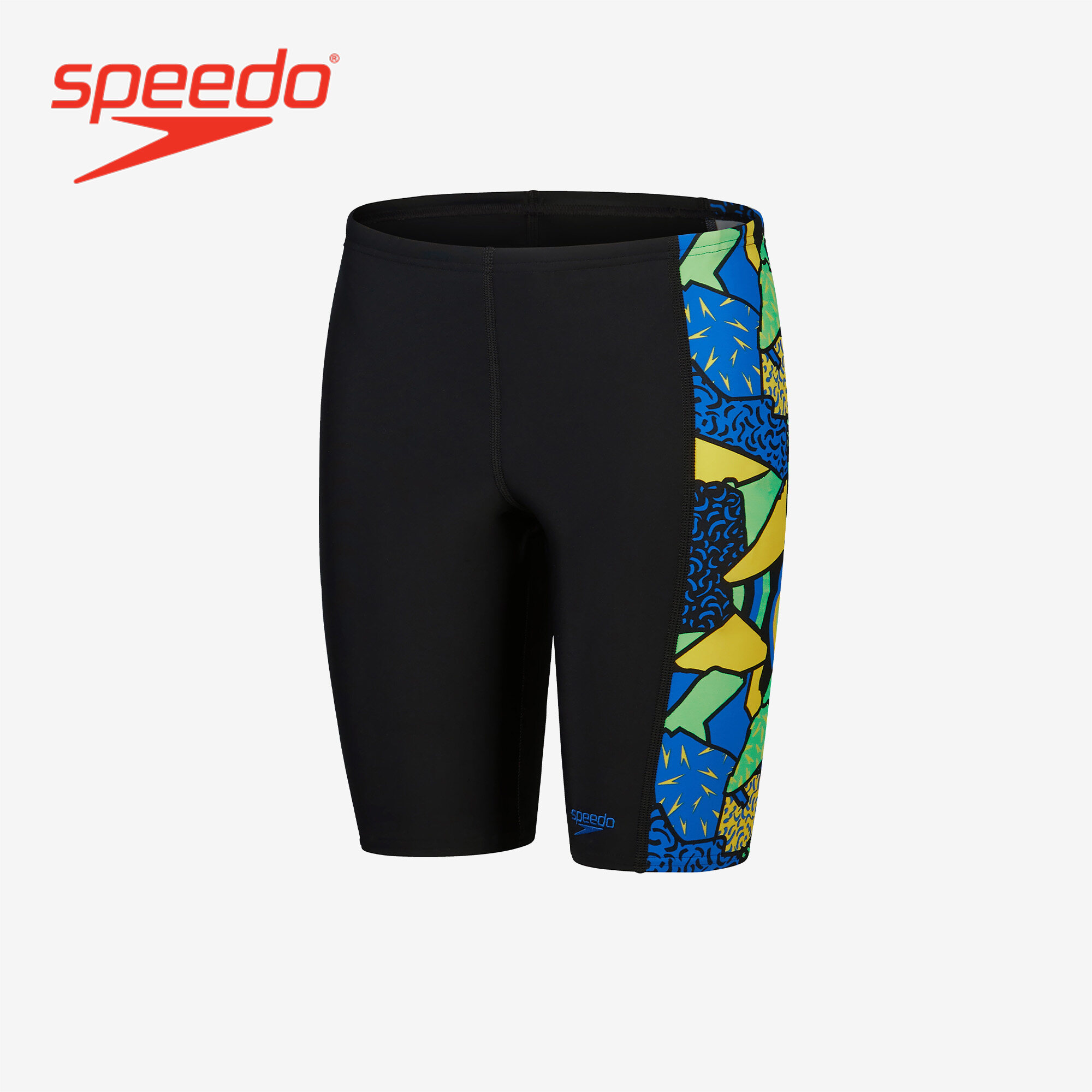 • Style and comfort for lessons and training. Ooze confidence wearing this sleek black Jammer, which features side panels of our high-energy abstract print in bright yellow, green and blue. Lined at the front for comfort and modesty, the jammer includes an internal drawcord to allow your child to achieve a secure and comfortable fit. Providing higher chlorine resistance than standard swimwear fabrics, it offers excellent shape retention and fits like new for longer with CREORA® HighClo. If you’re looking for great eco-credentials, it’s got those, too: our exclusive Eco EnduraFlex fabric is made from 100% recycled pre-consumer waste, such as fabric waste from factories.