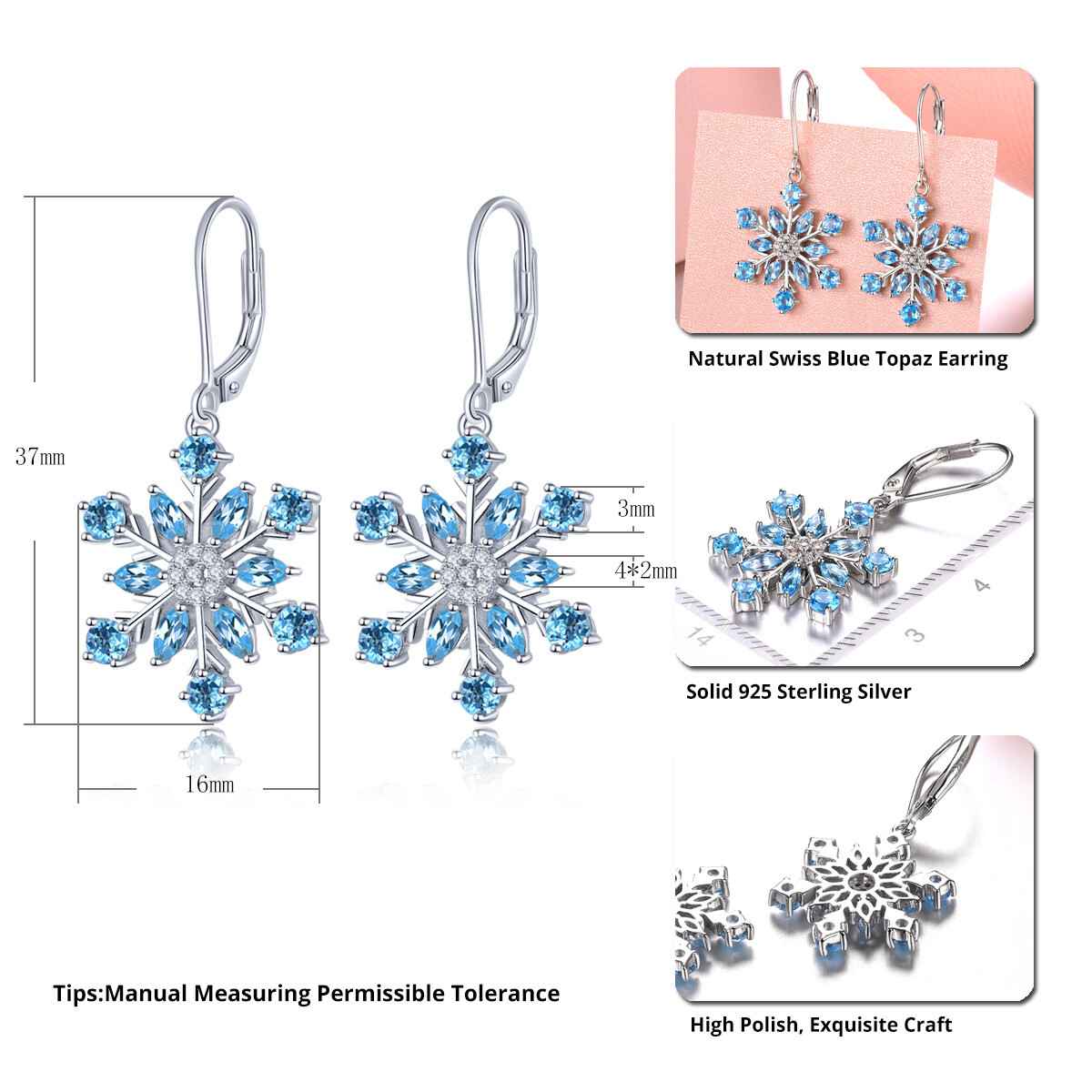 Natural Blue Topaz Sterling Silver Earrings Drop Earrings Silver 925 Original Design for Women 2.9 Carat Blue Snow Flower Design Romantic Korean Style Anniversary Wedding